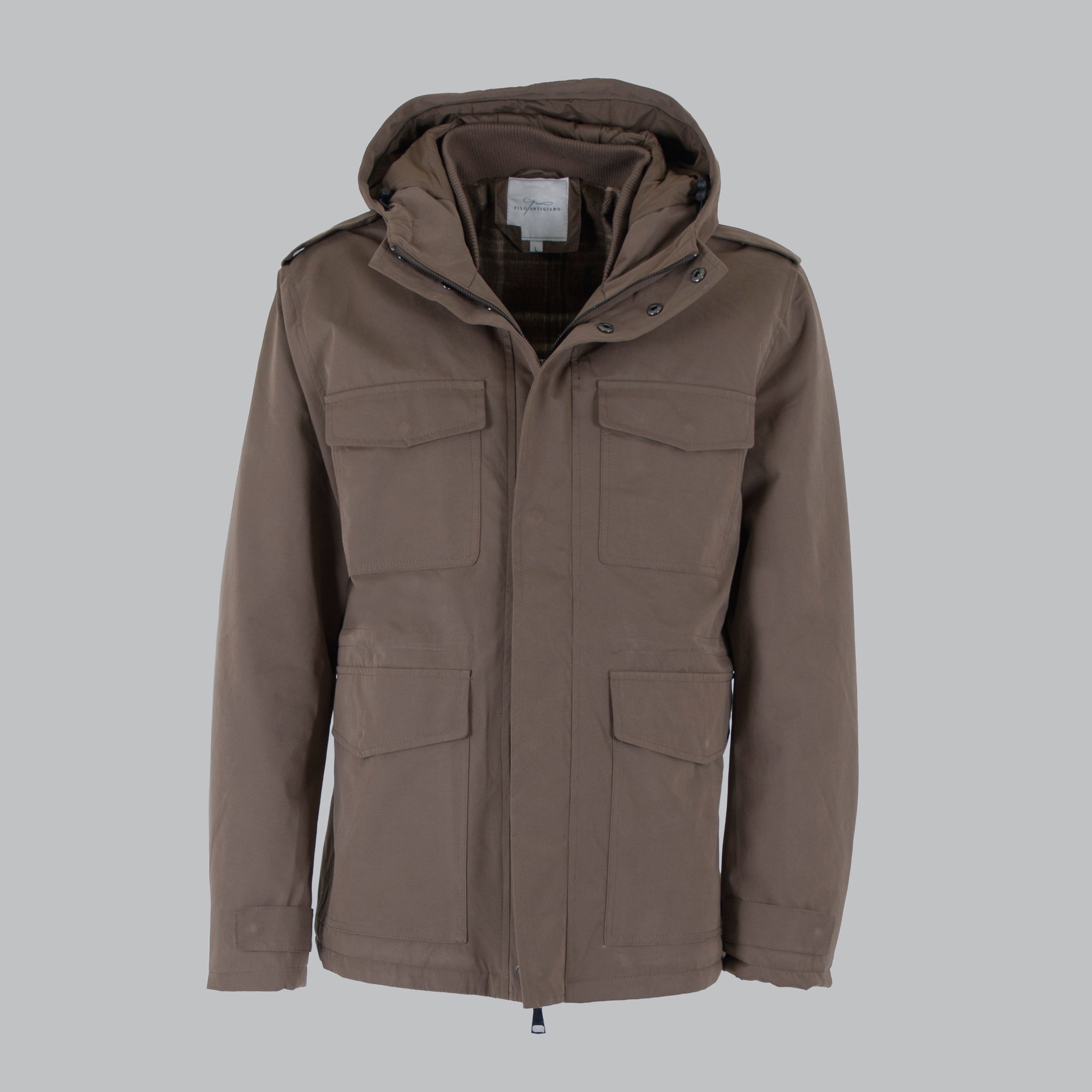 Made of peached cotton. Lined in a wool blend.