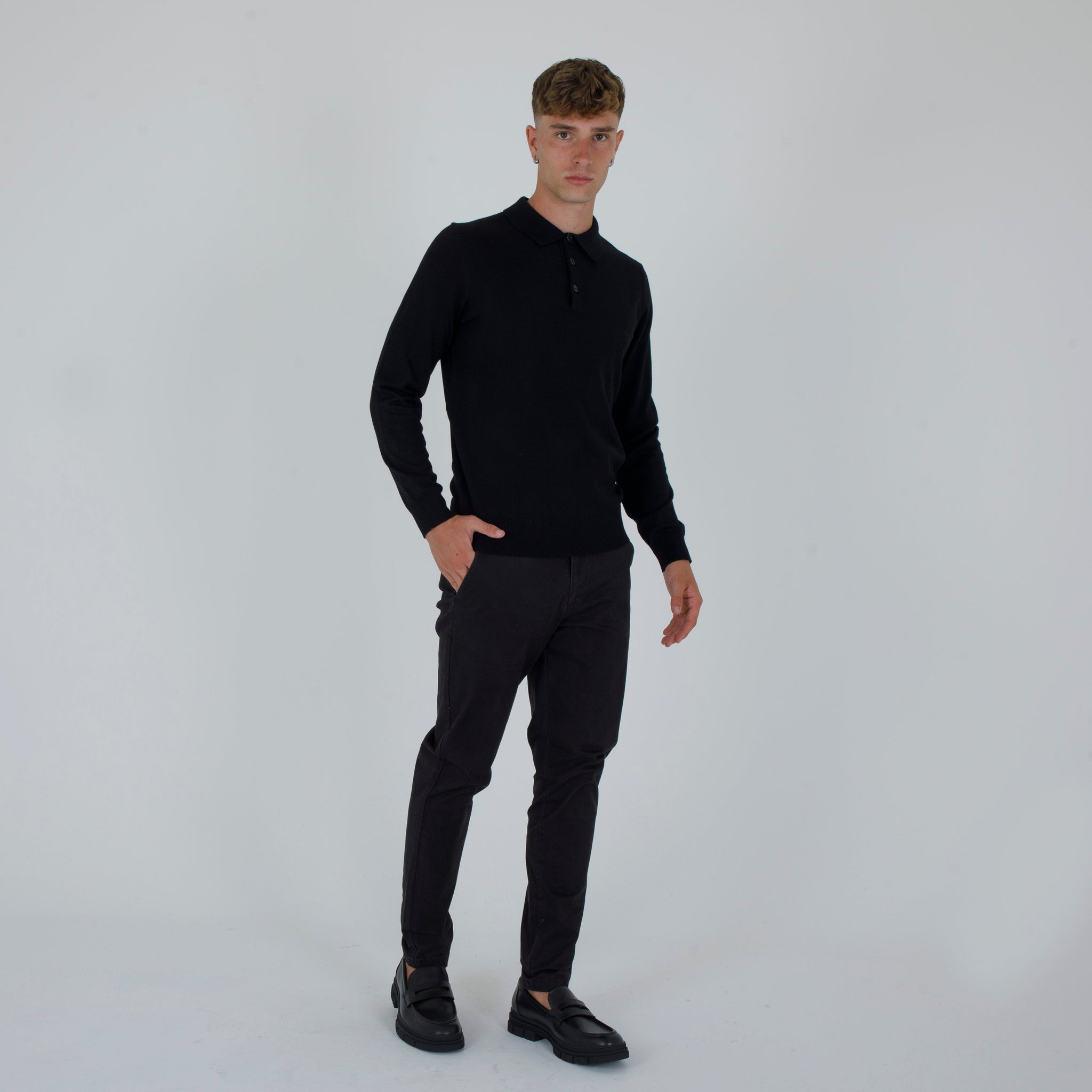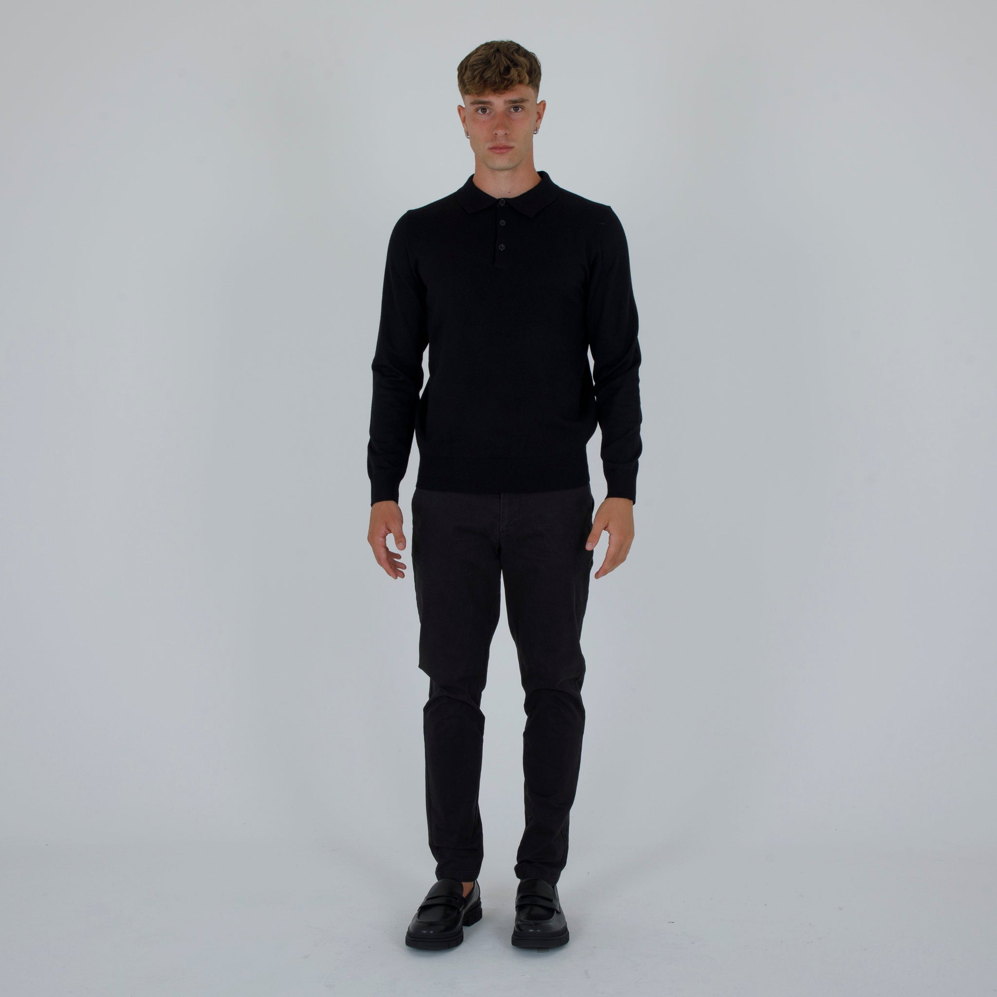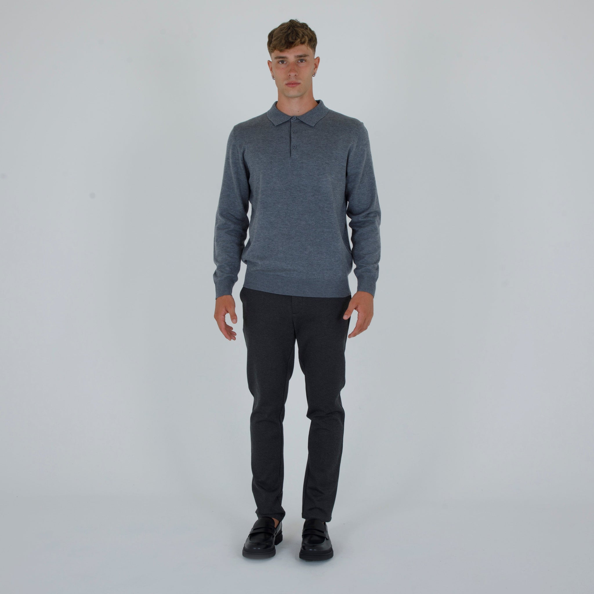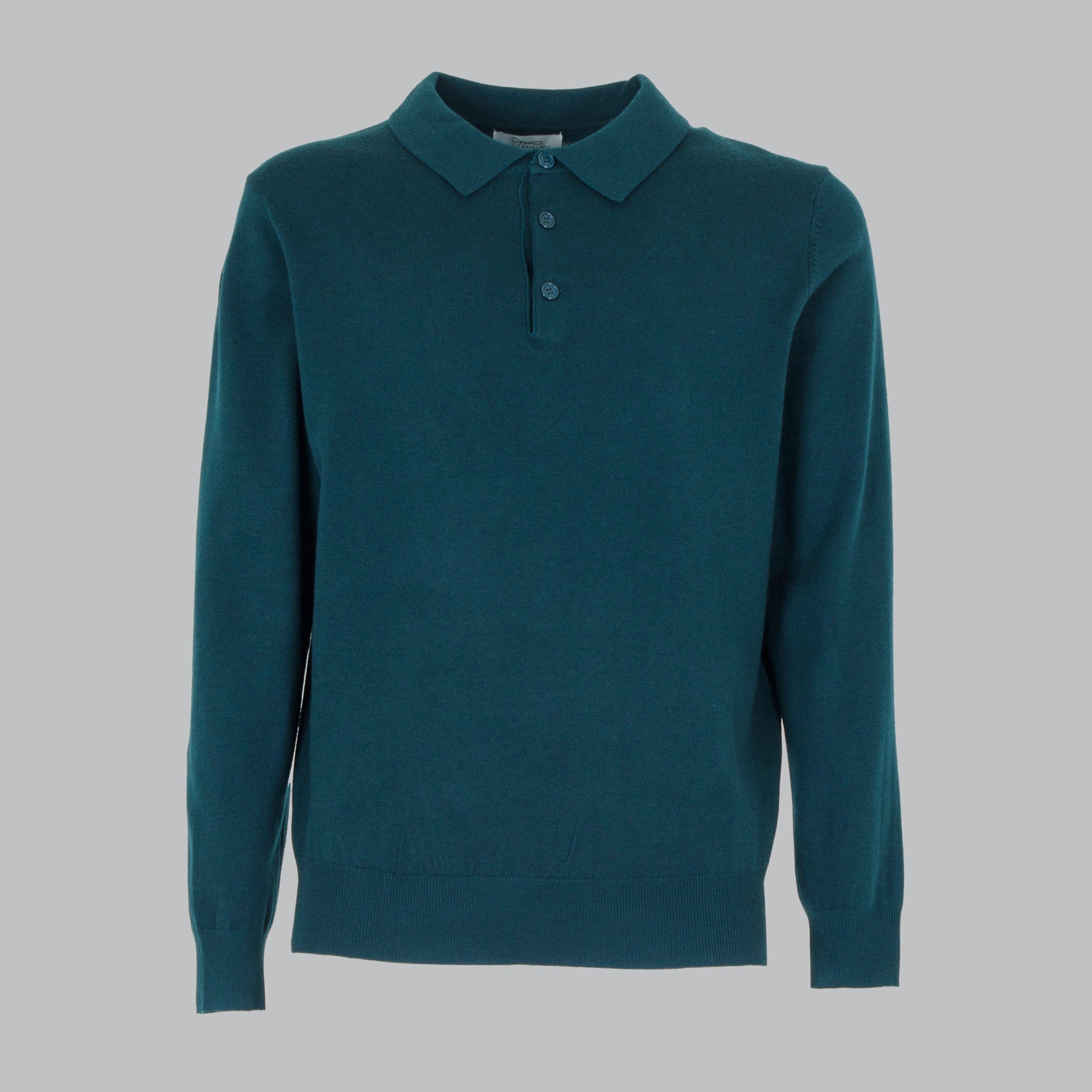 a wool blend polo shirt. Lapel collar with front opening. Sleeves