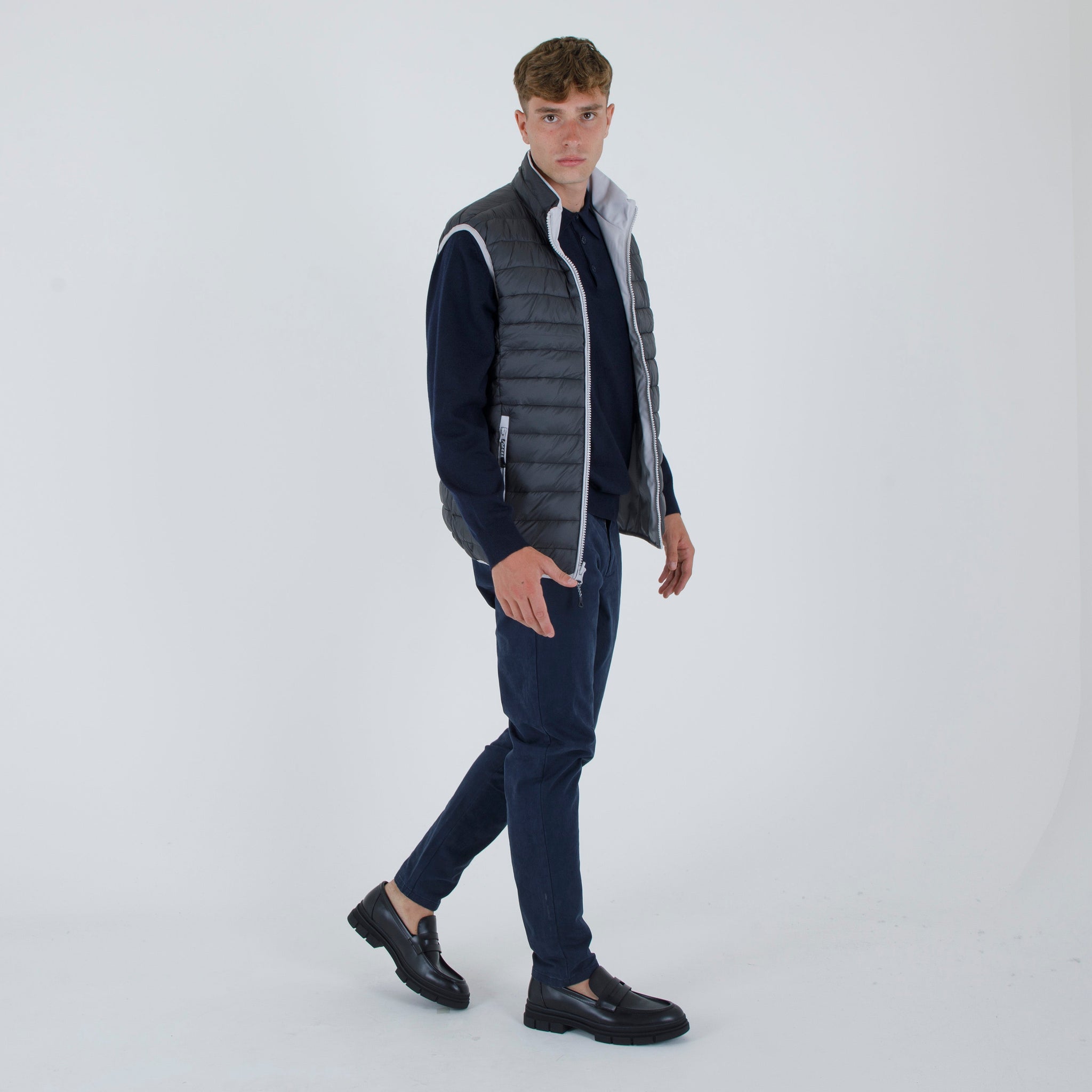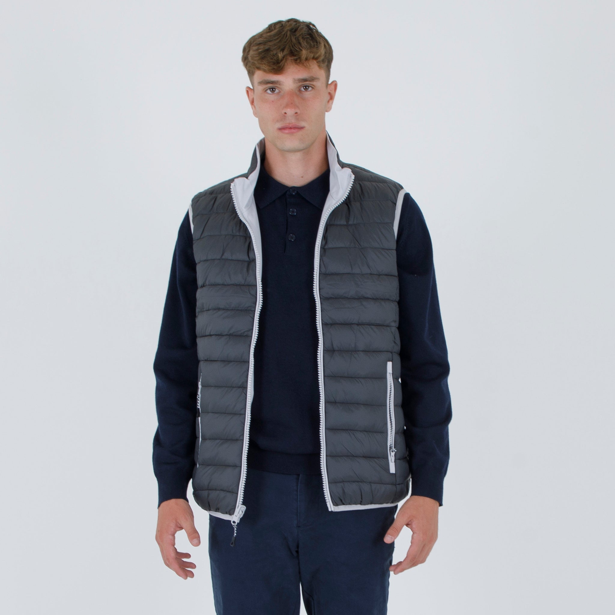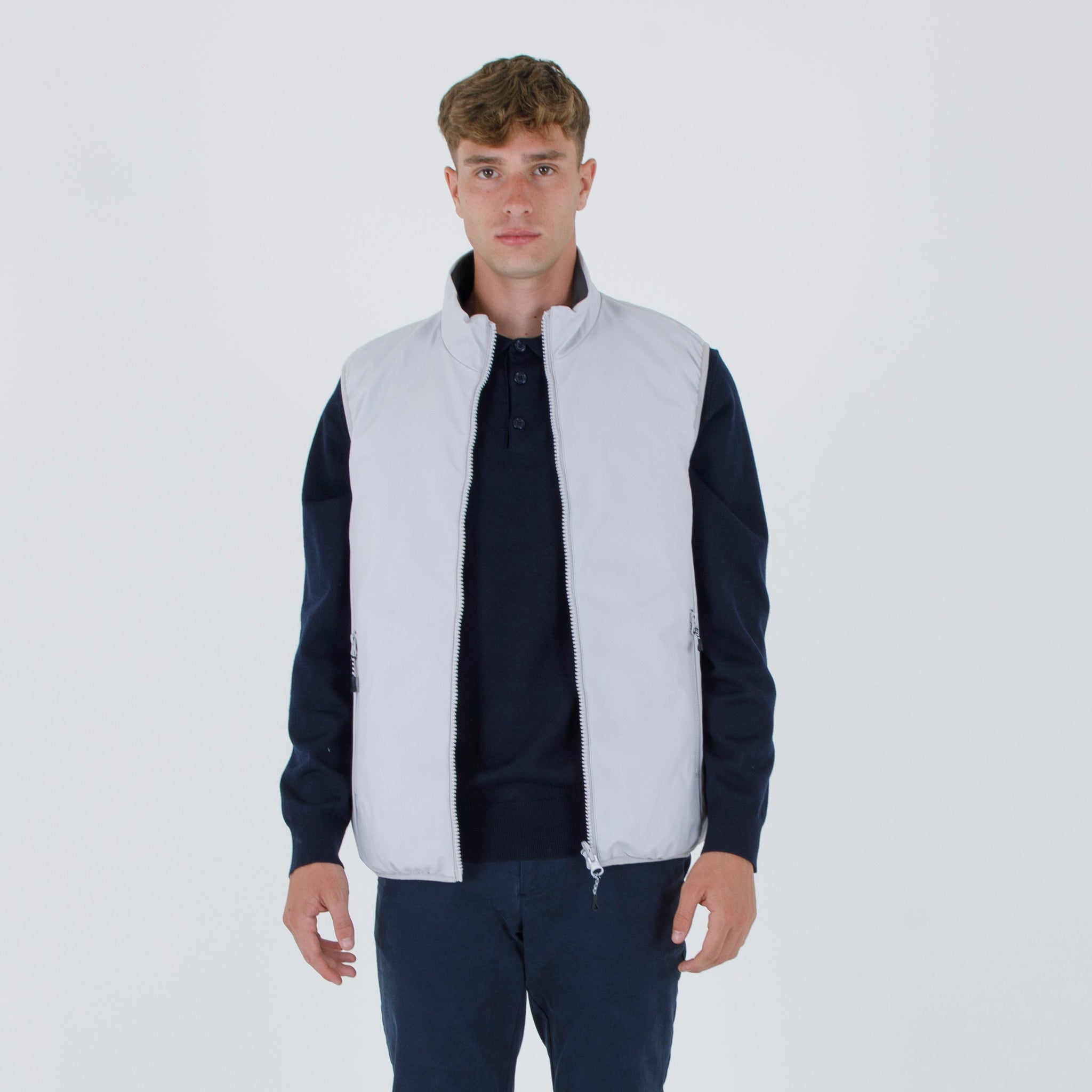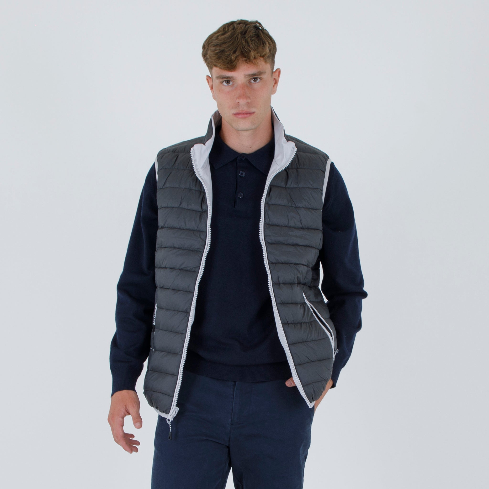 Gilet reversibile in due colori, realizzato in tessuto tecnico, l’altro lato è imbottito tipo piumino. Senza maniche, a collo alto. Tasche con chiusura con cerniera sui fianchi. Orlo con elastico. Chiusura frontale con cerniera.