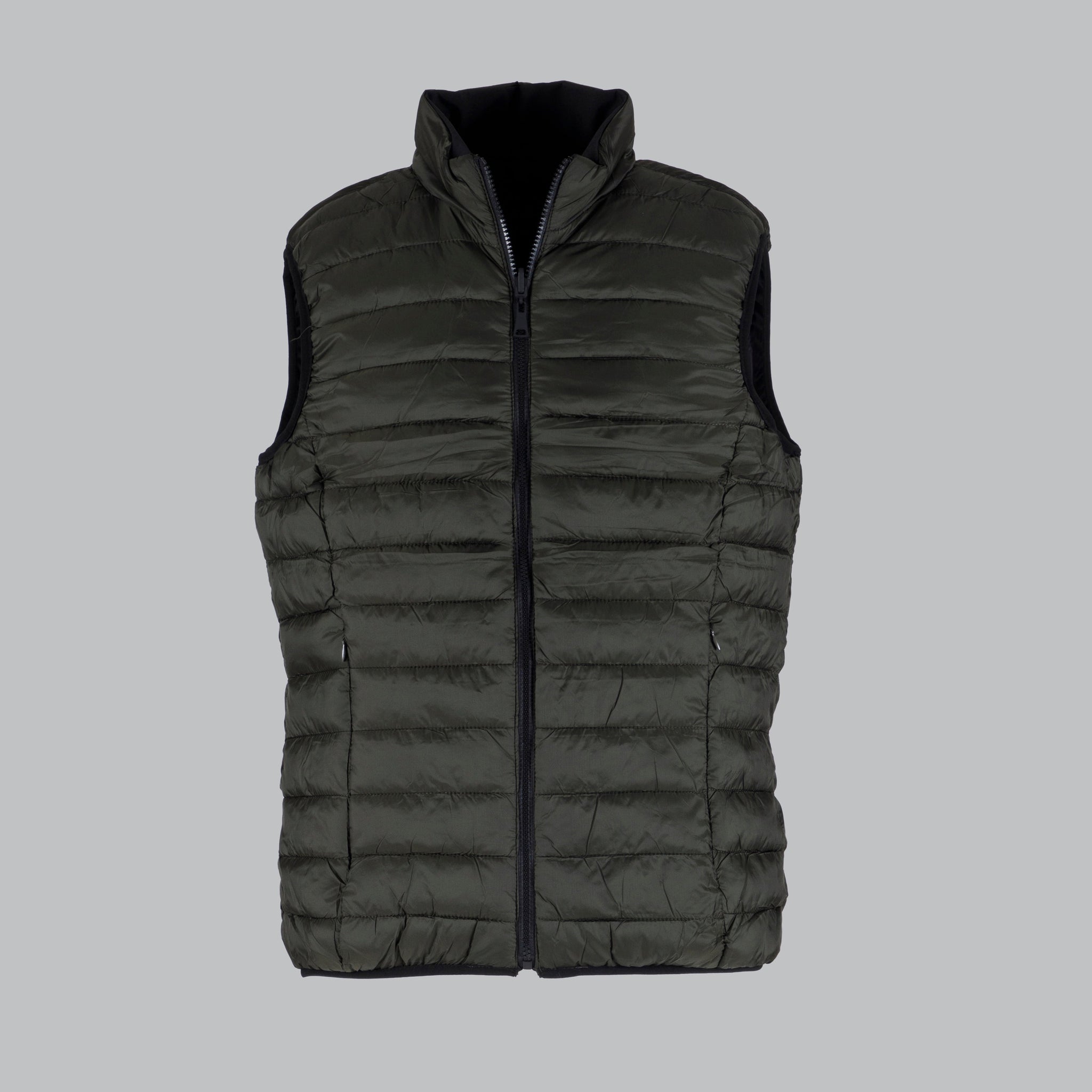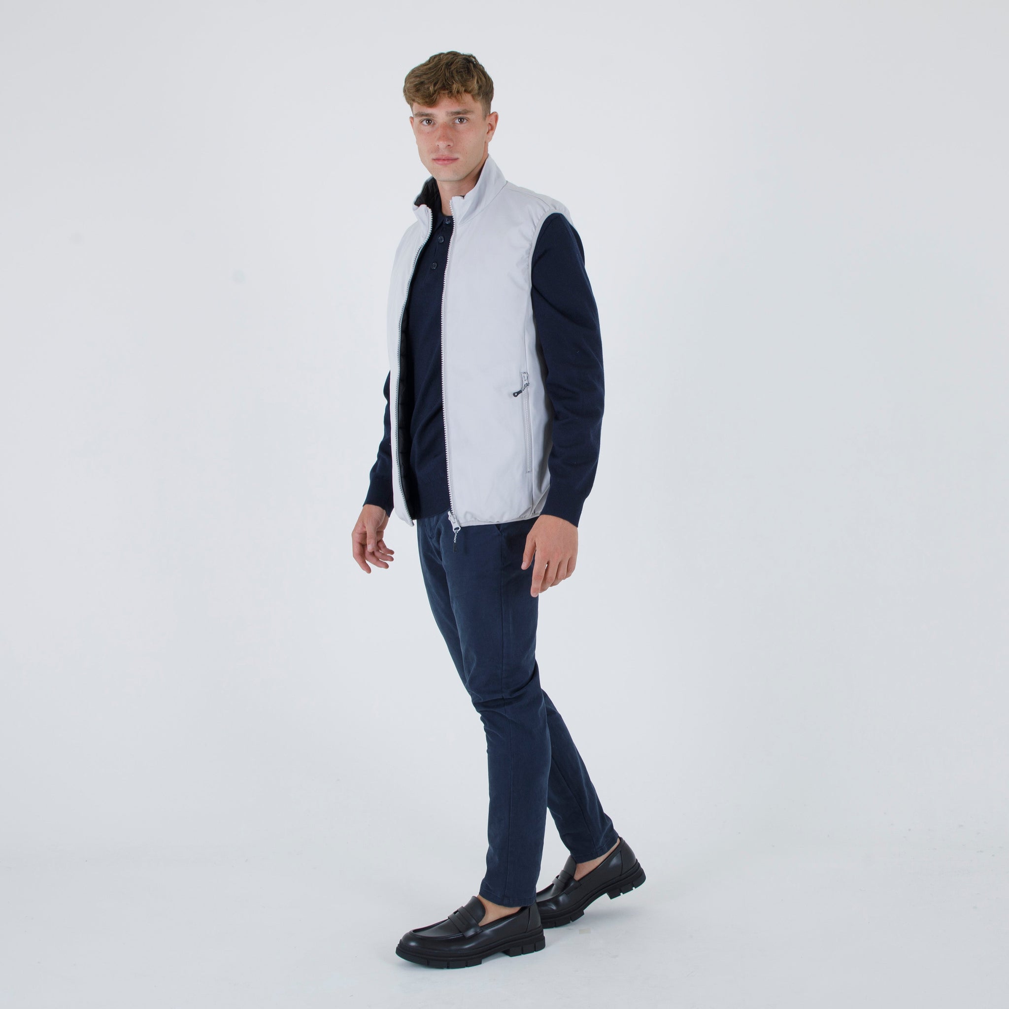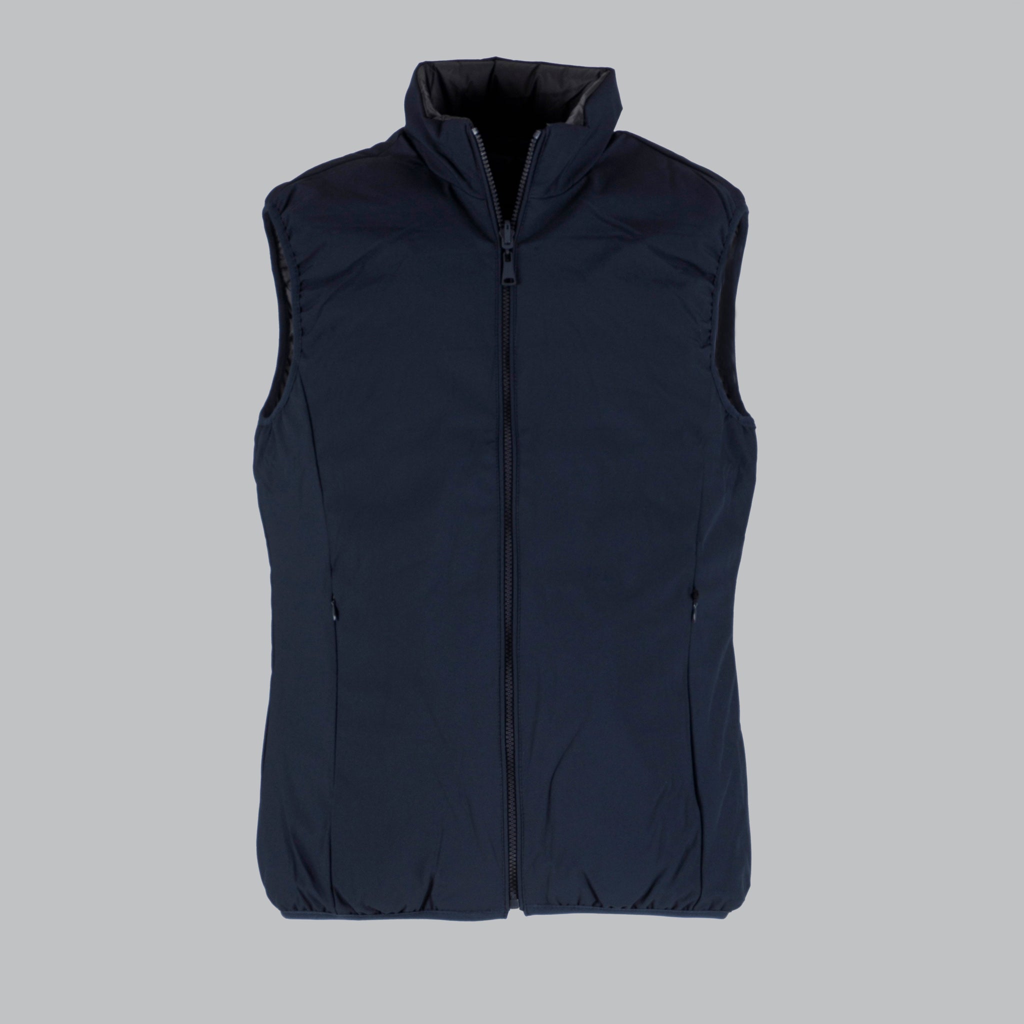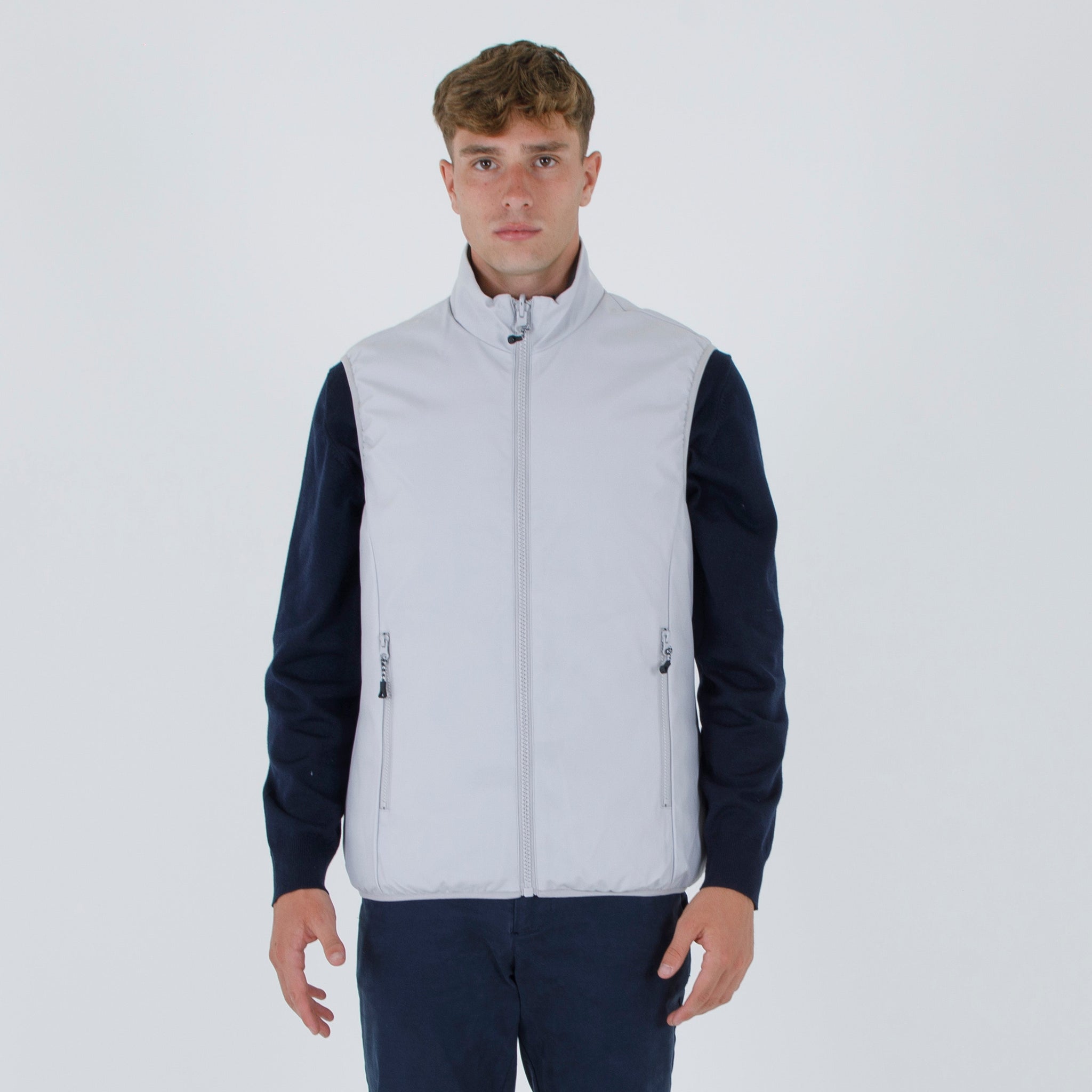 Gilet reversibile in due colori, realizzato in tessuto tecnico, l’altro lato è imbottito tipo piumino. Senza maniche, a collo alto. Tasche con chiusura con cerniera sui fianchi. Orlo con elastico. Chiusura frontale con cerniera.