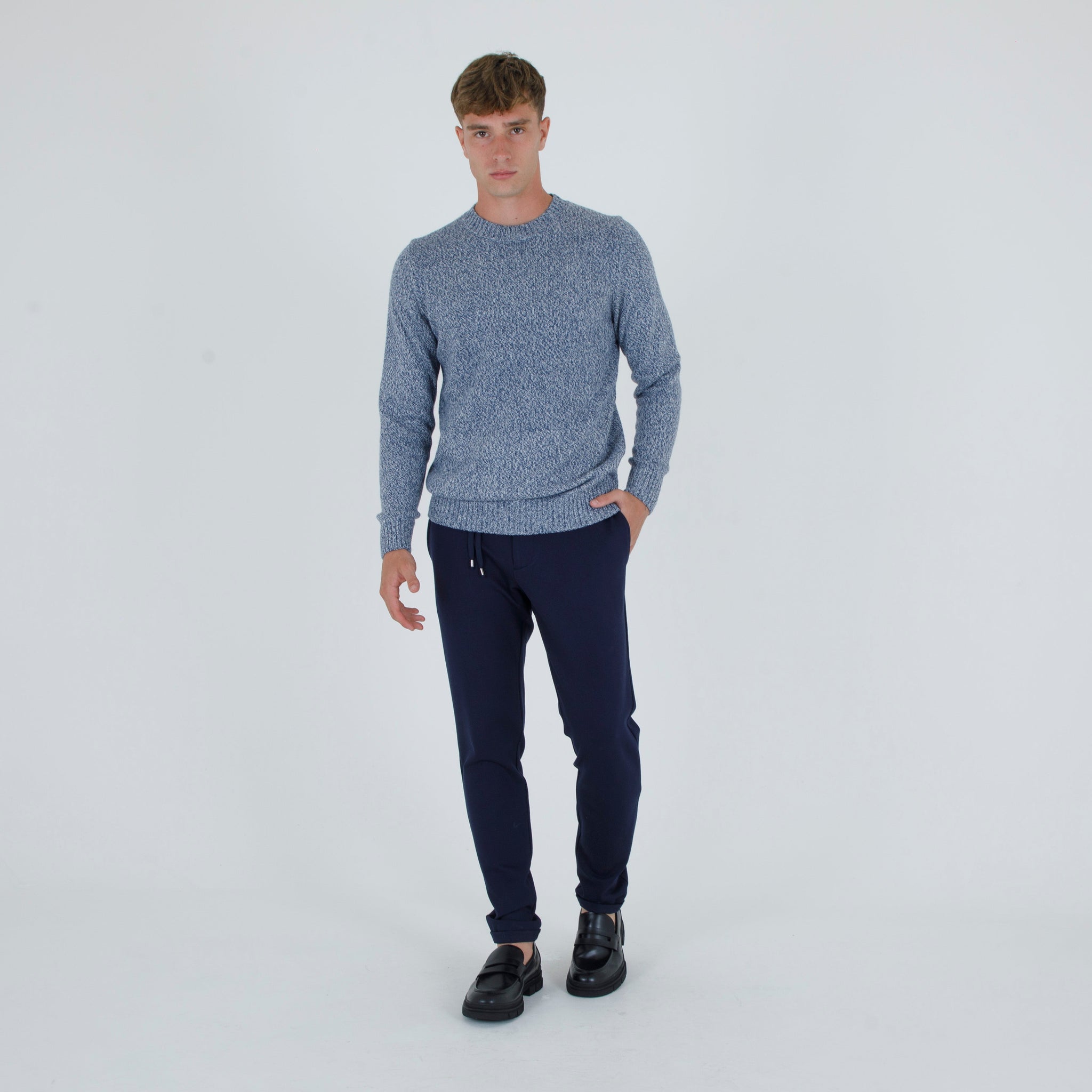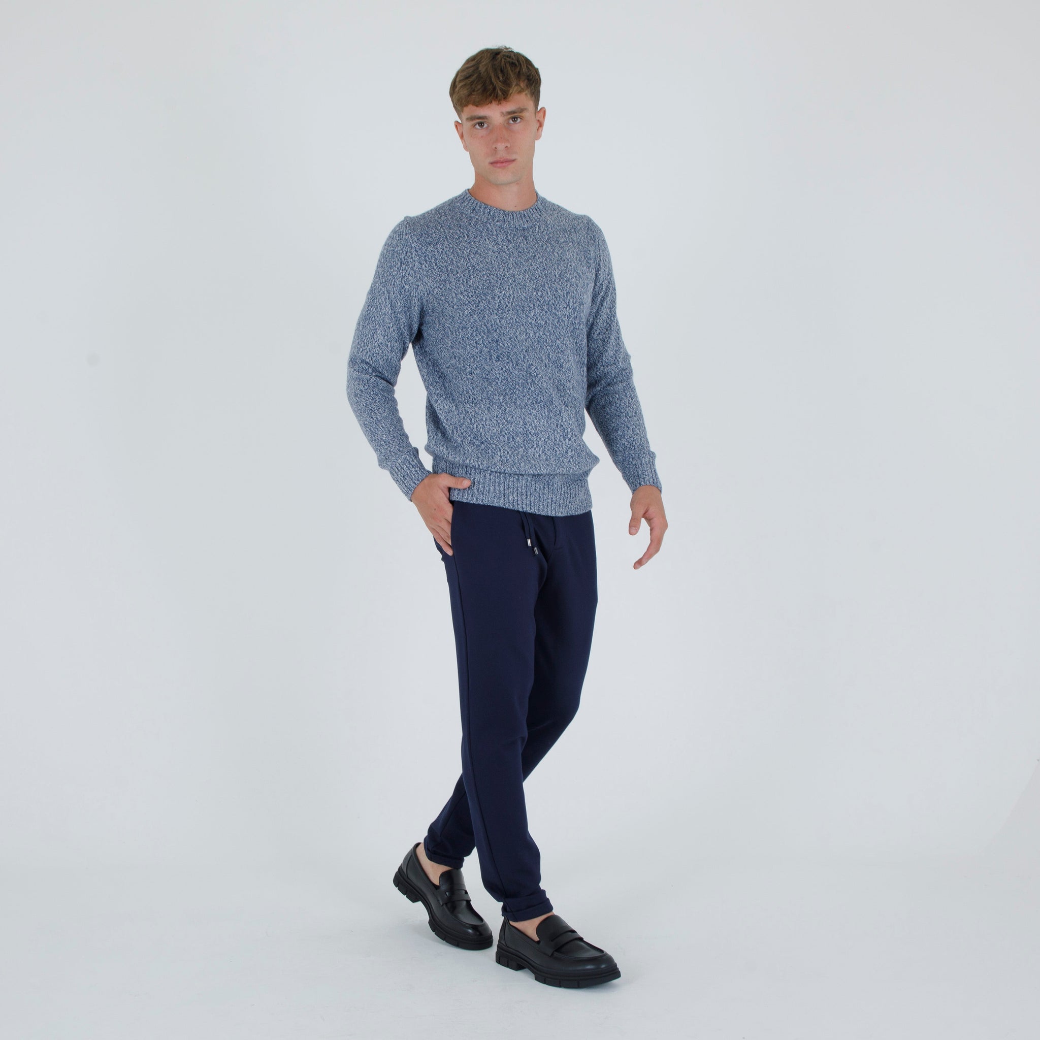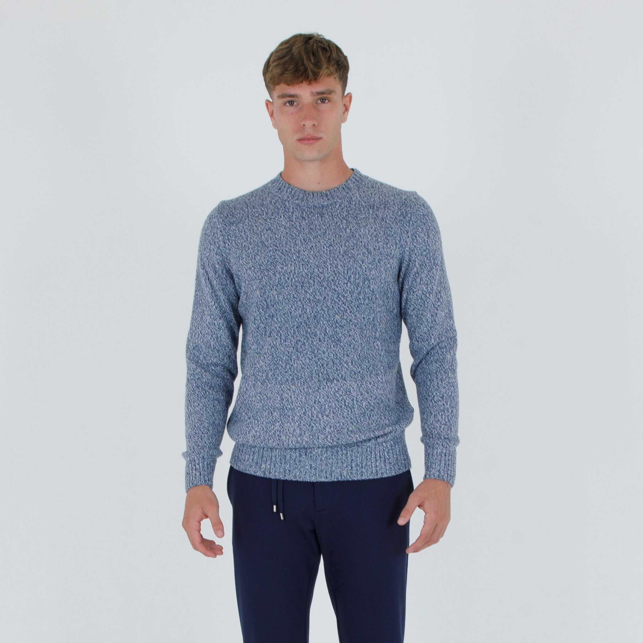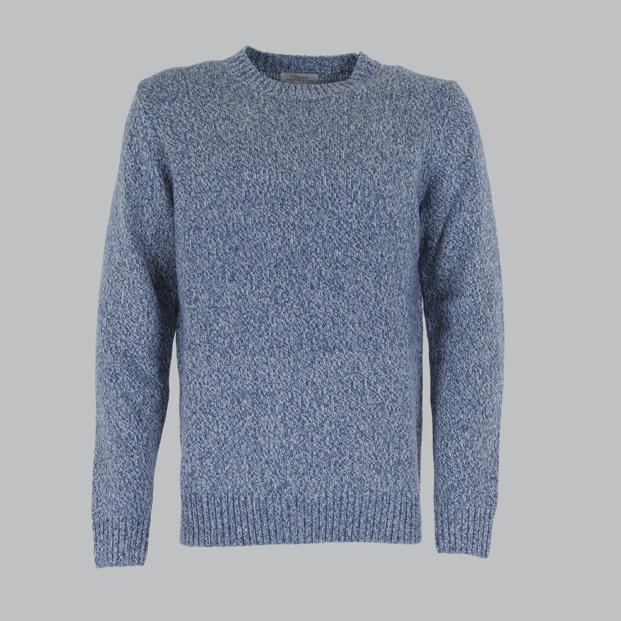 Maglia giro collo fiammato. Misto lana. Maniche lunghe con orlo a coste.